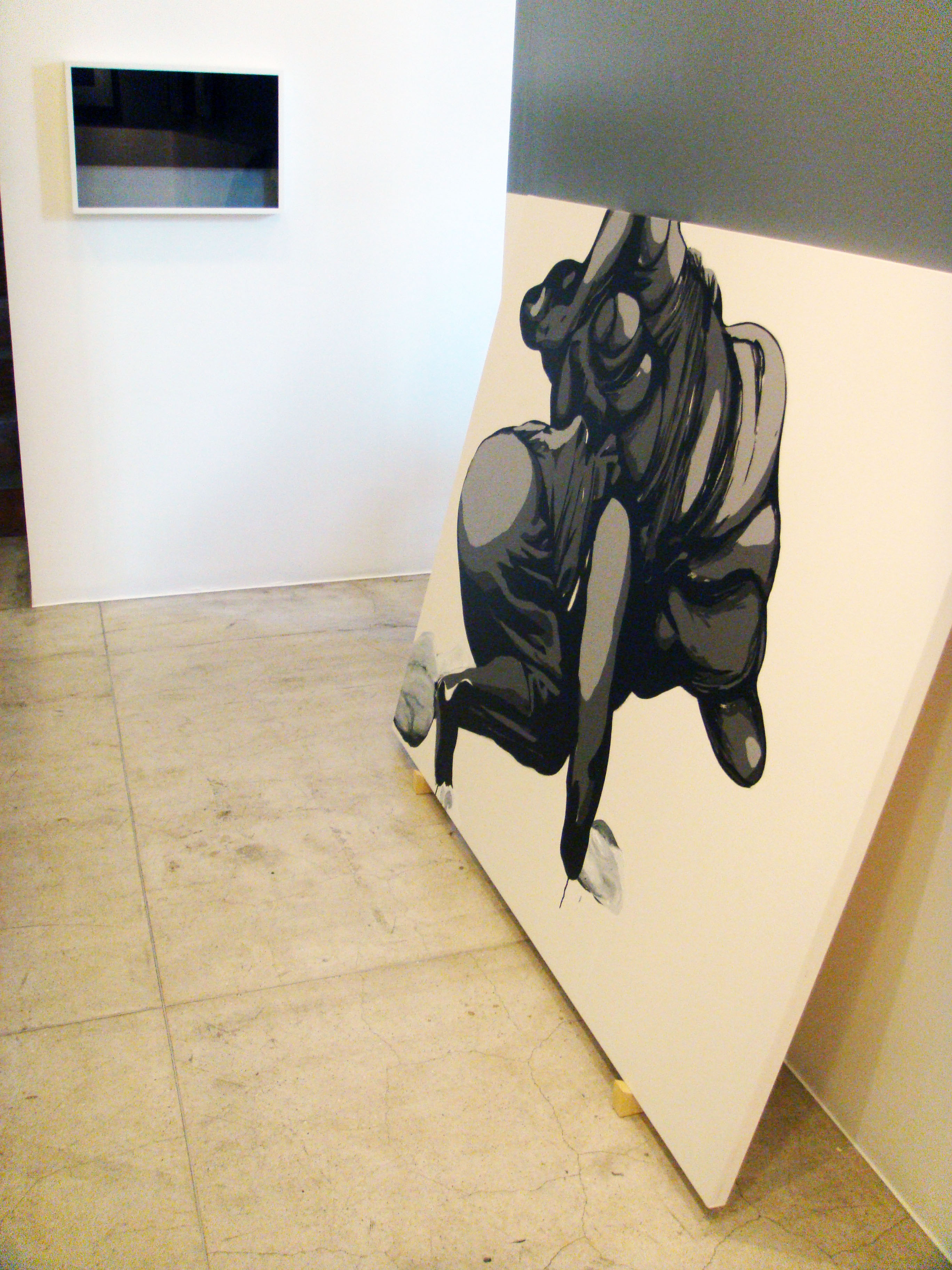 “nesta mostra, gilberto apresenta um trabalho concebido especialmente para o espaço expositivo caracterizado por um painel em “L.” O artista mostra duas telas em acrílico em grandes formatos, expostas no chão e encostadas na parede, como se imitassem a maneira em que algumas obras são expostas provisoriamente neste mesmo espaço quando mostrados a eventuais colecionadores. A 1,30 metros de altura, o painel expositivo recebe uma cor especial que remete a certas decorações de escritórios ou espaços institucionais. Sobre esta cor vão três folhas de papel carbono, restantes de desenhos que não estão presentes, sugerindo a contemplação de algo final que não se vê”