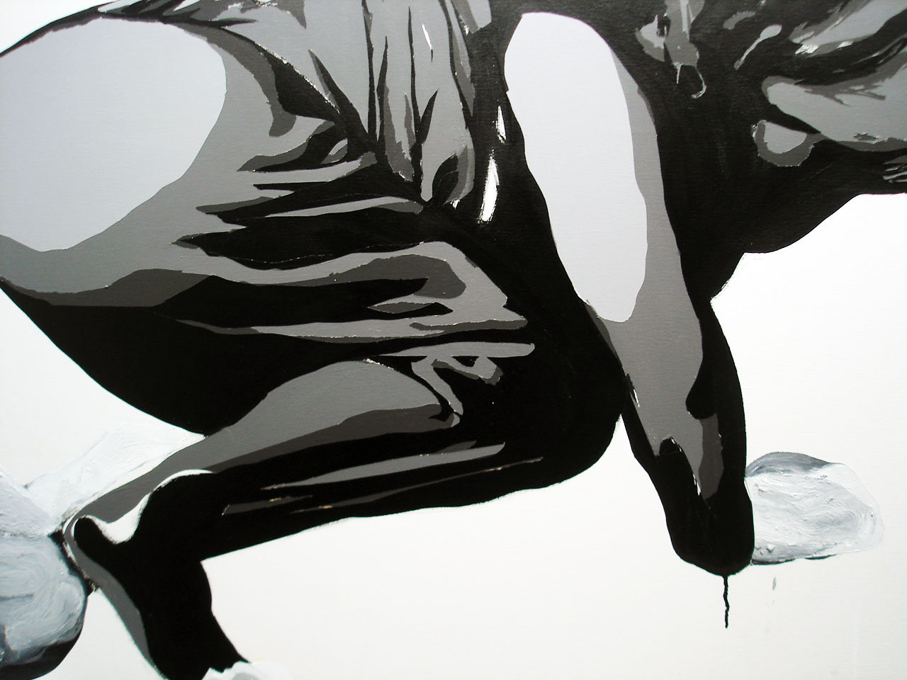 Trabalho 1 e Trabalho 2 (técnica mista sobre tela, 1,4x1,6m). Escritório ( três desenhos em papel carbono formato A4). Pintura em parede: barra impermeável branca sobre cinza médio.