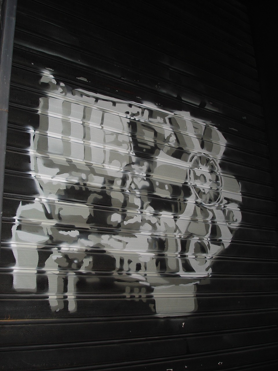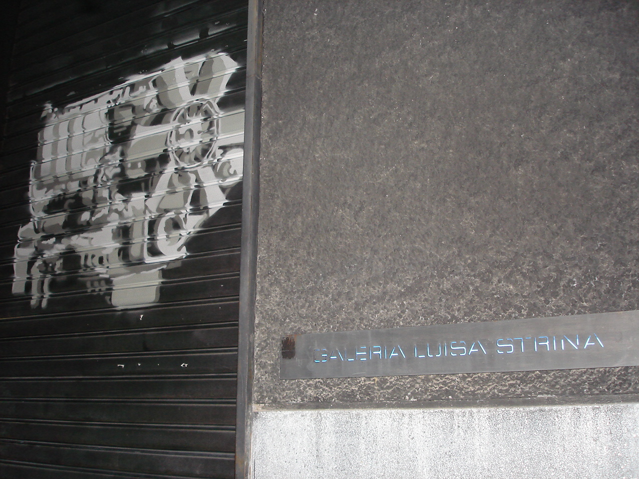 Pintura em porta de ferro retrátil da Galeria Luisa Strina, trabalho parte da exposição 'Contrabandos' com curadoria de carolina grau.